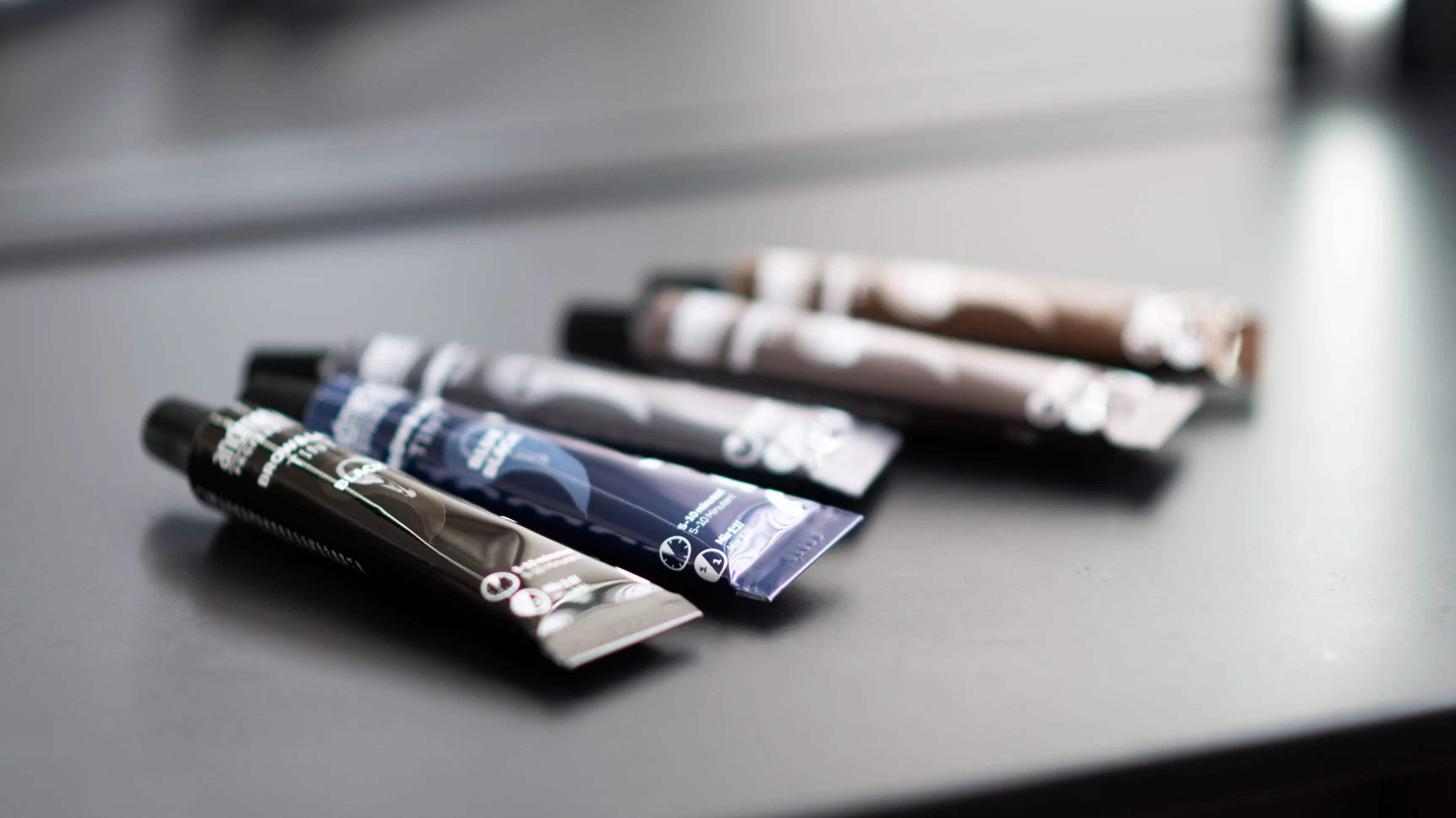 Farbe und Entwickler werden im Verhältnis 1:1 gemischt. Das heißt, 1 cm Farbe wird mit 1 cm Creme-Entwickler oder 8-10 Tropfen Flüssig-Entwickler vermischt.