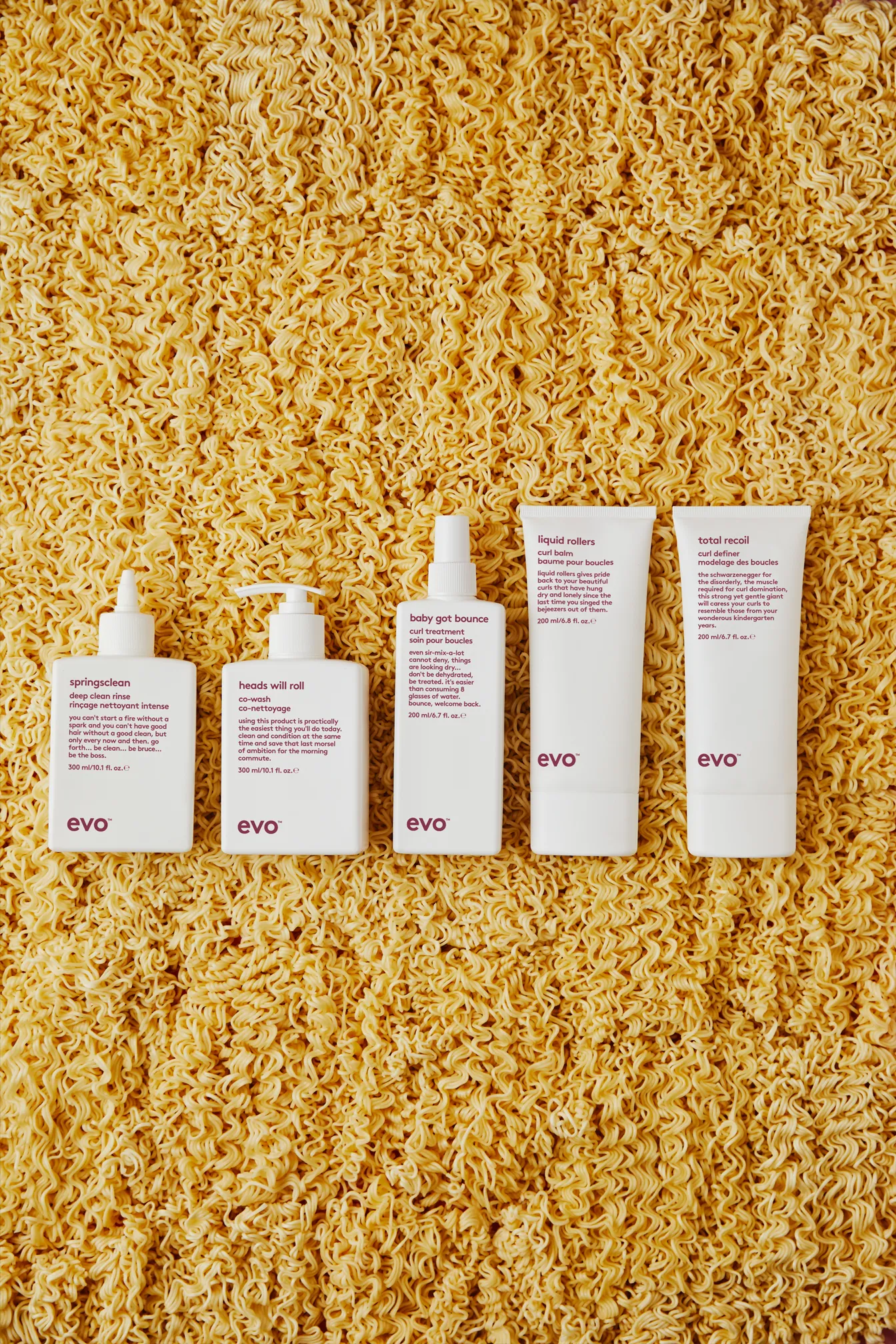 evo curl ist eine Haarpflege-Linie mit fünf Produkten für Locken und Wellen. Ein Kennzeichen der Marke evo hair sind die kurzen Anekdoten, die auf den Produktflaschen geschrieben stehen.