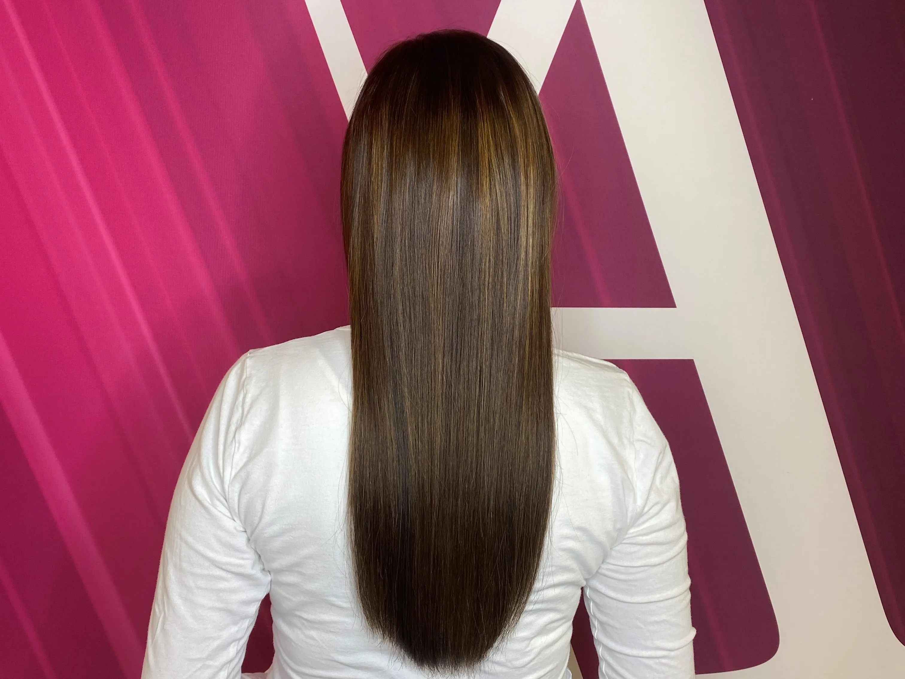 Wie es bei allen Colorationen der Fall ist, erfordern auch Karamell-Strähnen auf braunem Haar die richtige Pflege, um Farbintensität und Glanz beizubehalten. Die empfohlene Haarroutine besteht aus einem Shampoo und einer pflegenden Haarmaske.