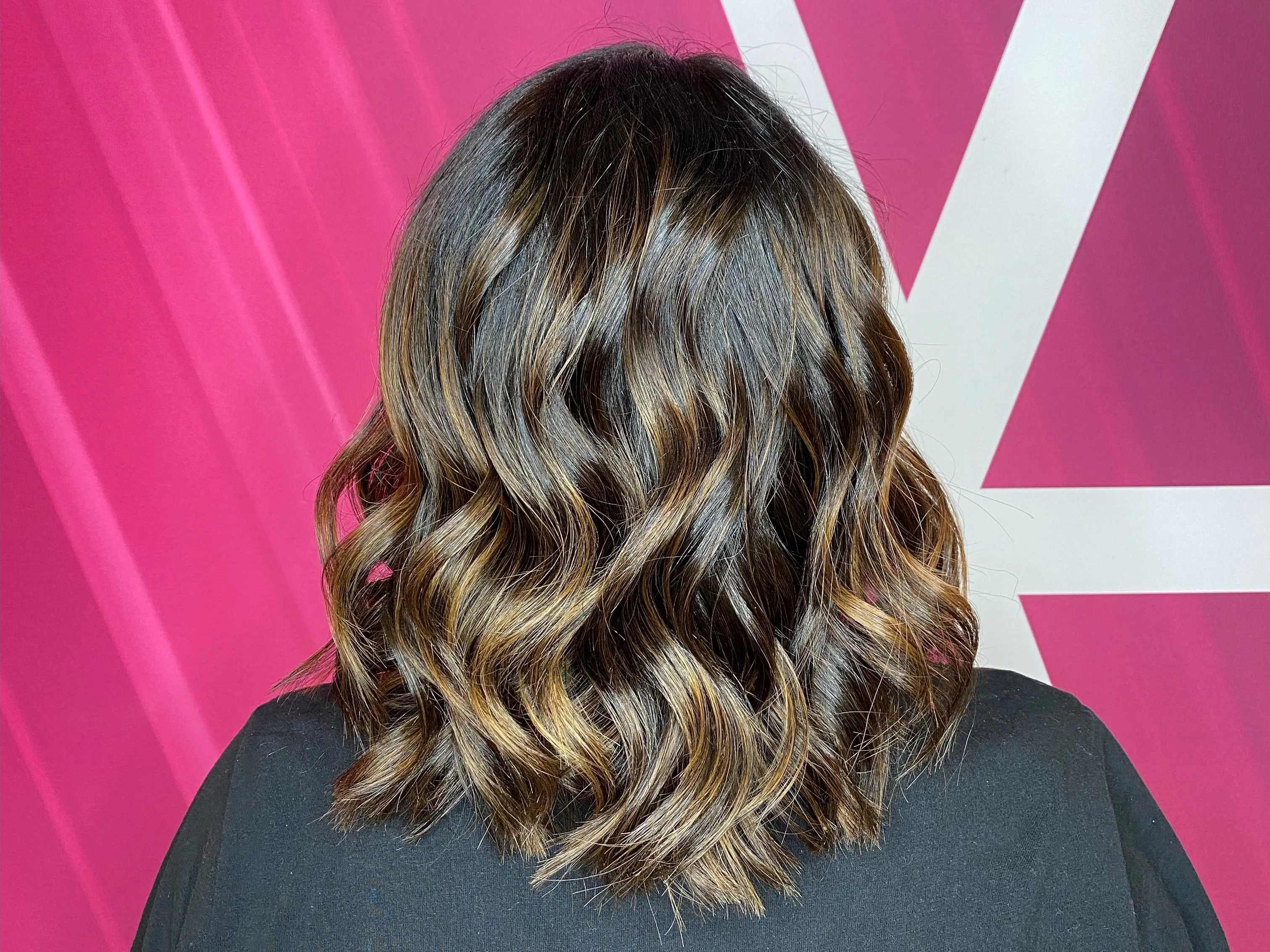 Balayage ist eine Freihand-Färbetechnik, die in Kombination mit einem glanzgebenden Farbservice wie Wella Shinefinity für Bewegung und das gewisse Extra sorgt. Braune Haare werden aufgewertet und sehen aus wie von der Sonne geküsst. Die Balayage sollte zwei bis drei Nuancen heller sein als die Ausgangshaarfarbe.