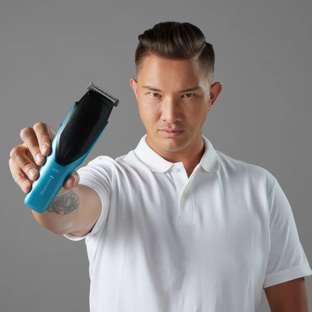 Der Remington Power-X-Series X5 Haarschneider HC5000 ist mit dem starken V3-Motor und den hochwertigen Edelstahlklingen besonders leistungsfähig. Egal ob feines, glattes, dickes oder krauses Haar – durch die dreifache Schneidleistung gelingt der gewünschte Look in Windeseile. Eine Besonderheit des Produkts ist der verstellbare Click-on Fade-Kamm mit 0,1 mm Schritten zwischen 1 und 5 mm. Zusätzlich sind 3 verstellbare Kämme im Lieferumfang enthalten. Somit sind 72 Längeneinstellungen möglich. Produkteigenschaften von Remington Power-X-Series X5 Haarschneider Edelstahlklingen in japanischer Qualität Dreifache Schneidleistung durch den V3-Motor 3 verstellbare Kämme 3-35 mm Micro Fade Haar- und Bartkamm 1-5 mm Turbo Boost Mikro-USB-Ladefunktion LED-Anzeige Abnehm- und abwaschbare Klingen