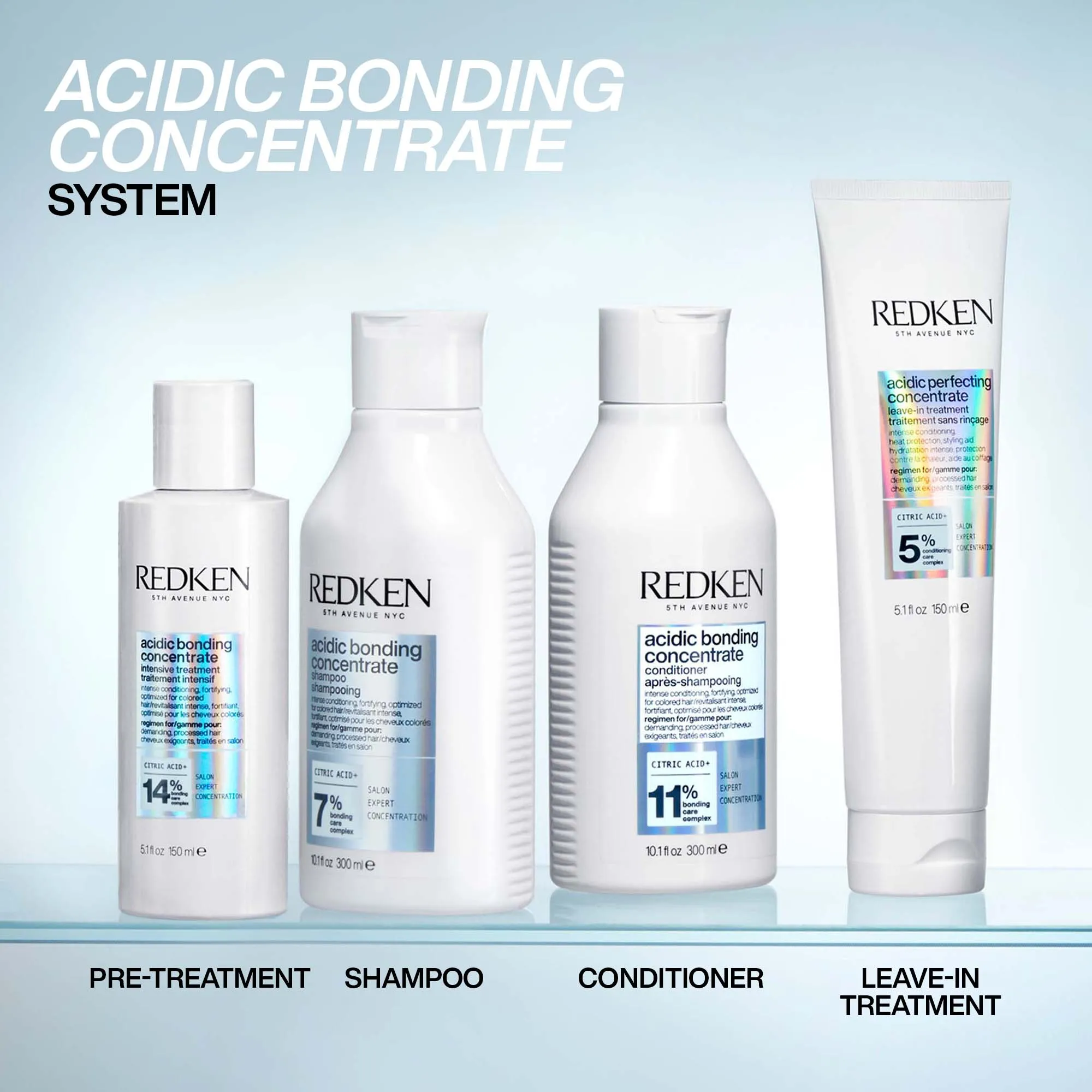 Die Redken Acidic Bonding Concentrate Pflegeserie besteht aus dem Redken Acidic Bonding Concentrate Shampoo, dem Conditioner und dem abschließenden Leave-In Concentrate. Alle drei Produkte sind mit dem Bonding-Care-Komplex ausgestattet und enthalten Zitronensäure. Die reparierende Formel in Redken ABC stärkt geschwächte Sulfitbindungen im Haar und minimiert Haarbruch. Das Redken Acidic Bonding Concentrate Shampoo enthält 7% des Bonding Care Complexes, im Conditioner sind 11% enthalten und im Leave-In Treatment 5%.