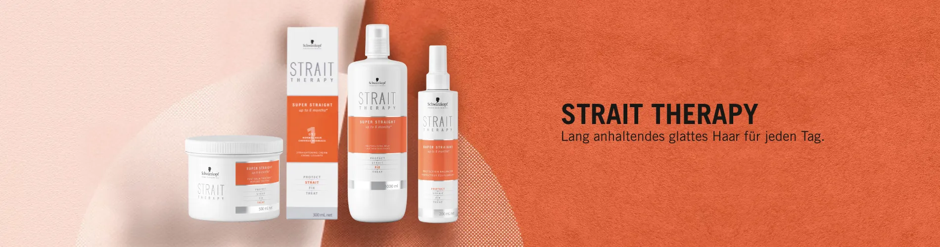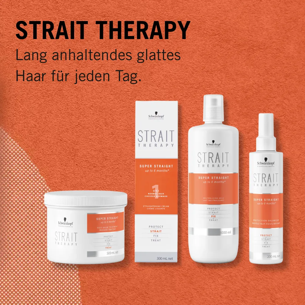 Mit Strait Therapy von Schwarzkopf zu langanhaltend glattem Haar, das glänzt. Die optimal aufeinander abgestimmten Produkte sorgen für eine dauerhafte Glättung des Haares. Schwarzkopf Strait Therapy verspricht superglattes Haar für bis zu 6 Monate mit einem ganz einfachen Programm.