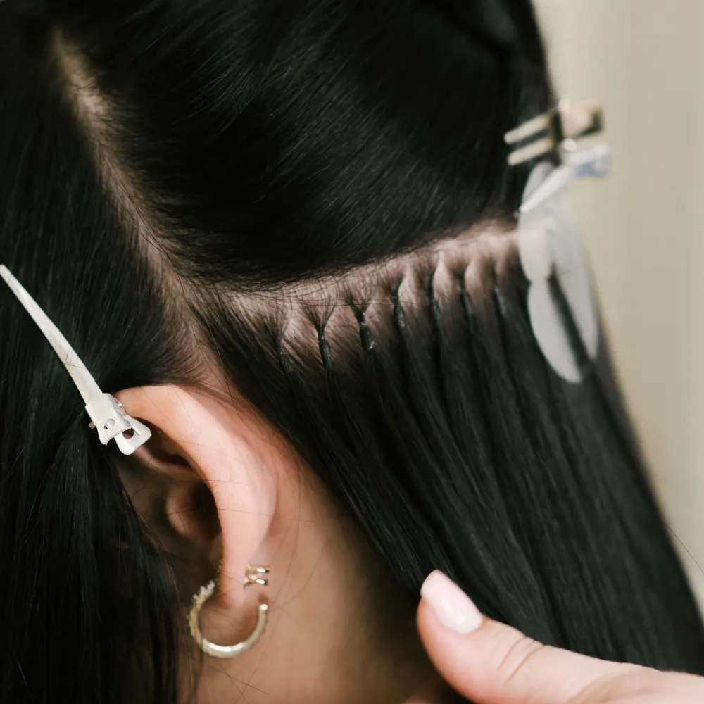 Die bekannten Keratin-Bonding Extensions bestehen aus Echthaar, die mit Keratin-Verbindungen mittels Wärmezange am eigenen Haar angebracht werden. Diese Technik garantiert perfekte Ergebnisse, da die Befestigungsstelle fast unsichtbar ist.