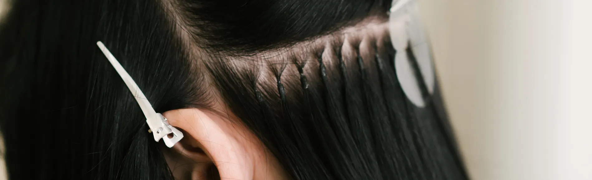 - Nun wird die Extensions-Strähne nahe an der Kopfhaut angelegt.