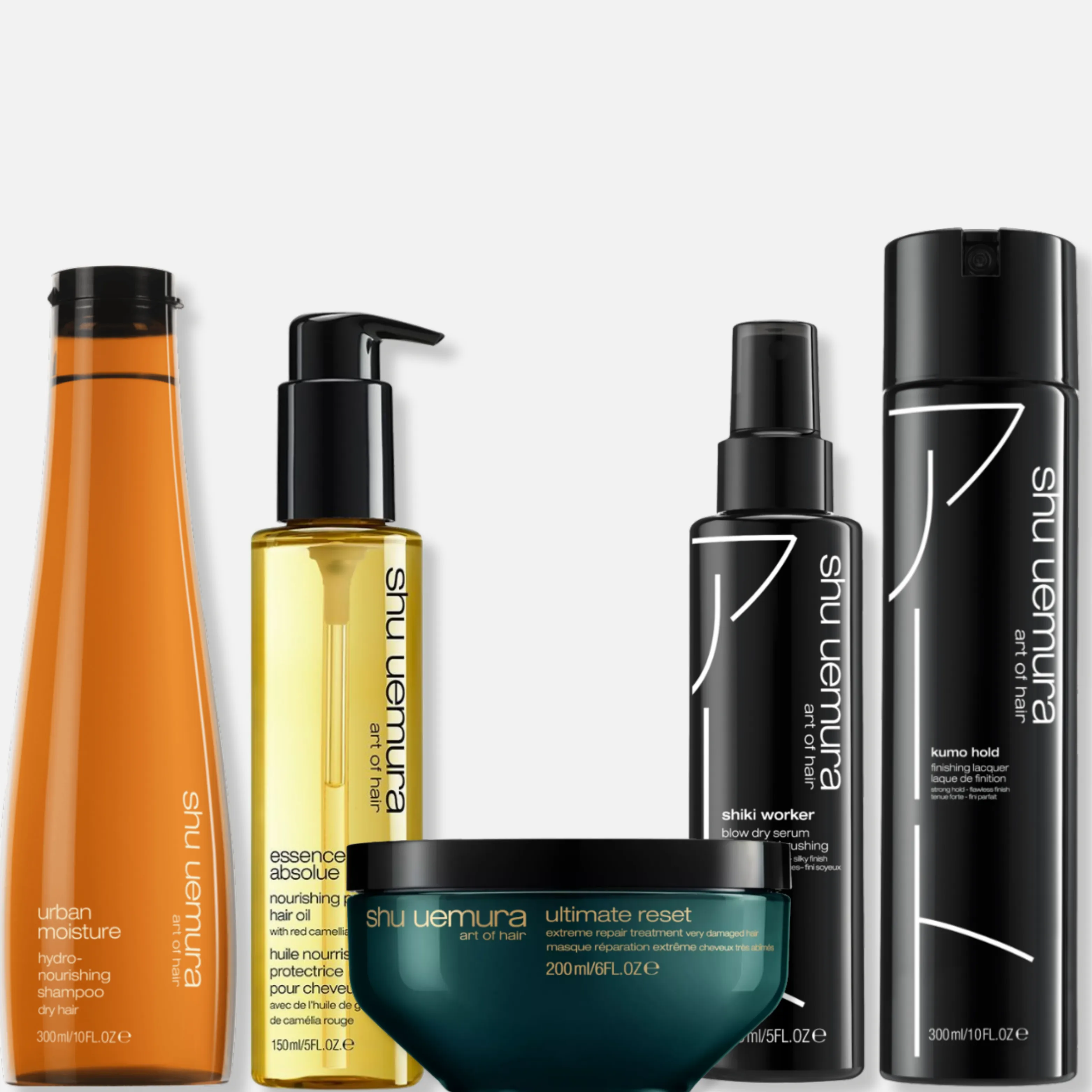 Lasse dich von den Bestsellern von Shu Uemura inspirieren und finde die richtigen Produkte für deinen personalisierten Stil, der von minimalistischer Schönheit geprägt ist. Drücke deine Persönlichkeit über dein Haar aus und verleihe mit der Ultimate Reset Maske mehr Geschmeidigkeit, schütze dein Haar mit dem Shiki Worker und finalisiere deine Frisur mit Kumo Hold. Für mehr Feuchtigkeit wasche dein Haar mit dem Urban Moisture Shampoo und veredele es mit der Essence Absolue. Inhaltsstoffe rund um das Onsen-Ferment, Argan Öl, Moschusrosenöl und Schwarzkümmelöl hüllen dein Haar in den für Shu Uemura besonderen Duft, der deine einzigartige Ausstrahlung betonen wird.