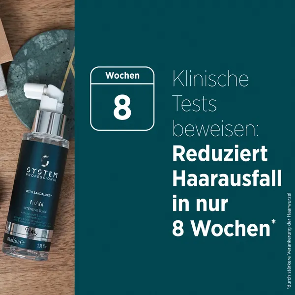 System Professional MAN Intensive Tonic ist eine Anti-Schuppen- und Anti-Haarausfall-Behandlung mit Sandalore, Koffein und Laurinsäure. Es ist klinisch erwiesen, dass der Haarausfall in 8 Wochen bei 80% der männlichen Anwendern reduziert wird. Außerdem werden Schuppen, Schuppenbildung und Juckreiz auf der Kopfhaut verringert. Anwendung von System Professional Lipid Code MAN Intensive Tonic Wende 12-15 Pumpstöße direkt auf der trockenen und feuchten Kopfhaut an. Gleichmäßig verteilen und mit einer Kopfhautmassage einarbeiten.